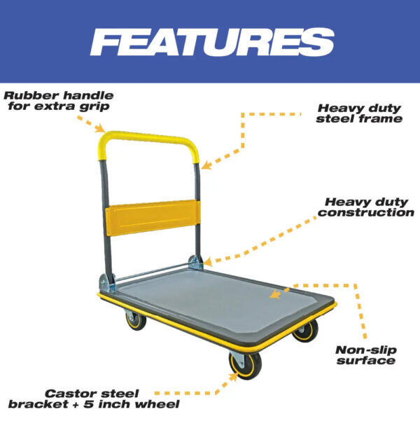 Discover the Heavy Duty Push Cart with a 660 lb capacity, foldable design for easy storage, and 360-degree swivel wheels for enhanced mobility.