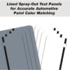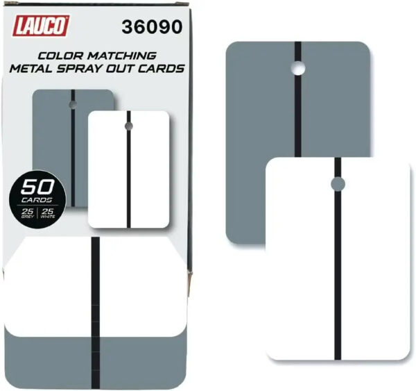 Professional LAUCO metal spray out cards for accurate automotive paint color matching. Dual white & grey panels, solvent-resistant, 4×6 size.